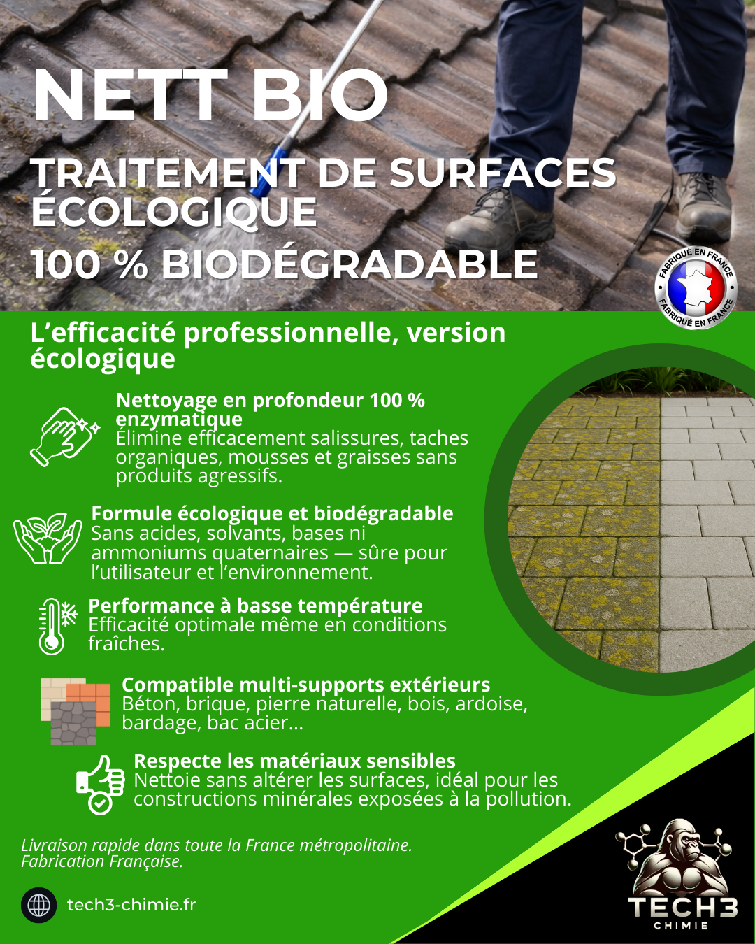 NETT BIO est un nettoyant enzymatique écologique, spécialement formulé pour éliminer efficacement les salissures, taches organiques, mousses et résidus graisseux sur tous types de surfaces extérieures. Grâce à l’action naturelle des enzymes, il dégrade les particules de saleté en profondeur sans avoir recours à des produits agressifs, laissant les surfaces propres, saines et rafraîchies.